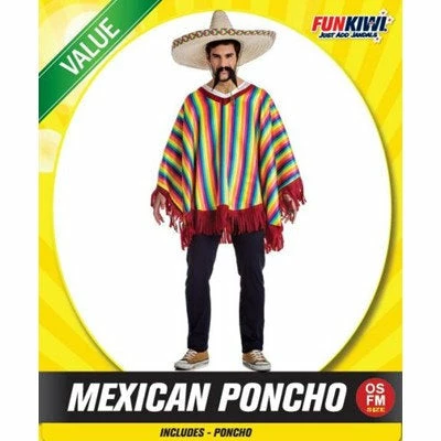 Value for money, striped satin Mexican Poncho with maroon fringing.