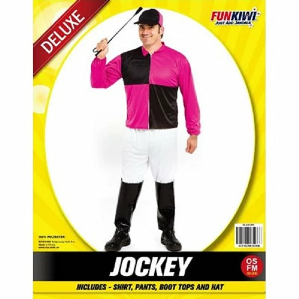Mens Jockey costume, shirt is black and pink, white pants, boot tops and cap.