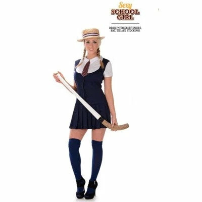 Sexy School Girl dress with shirt insert, Straw Hat, Tie and Stockings.