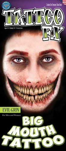 A temporary tattoo that’ll make anyone smile, or scream. The Tinsley Big Mouth Tattoo Kit FX Temporary Tattoo in the Evil Grin style is one tattoo with a brush and black face paint tube. To complete the look without any extras.
