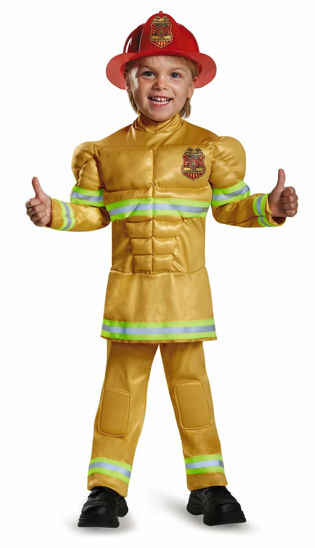 Dress up as a courageous firefighter and come to the rescue in this Fearless Fireman Boys Toddler Costume!! Your sure to become a local hero and impress all your friends and parents when you wear this costume to your next Firefighter themed partie or dress up partie!! This Costume features a yellow jumpsuit with muscle torso and arms, and a fire fighter hat!!Â
