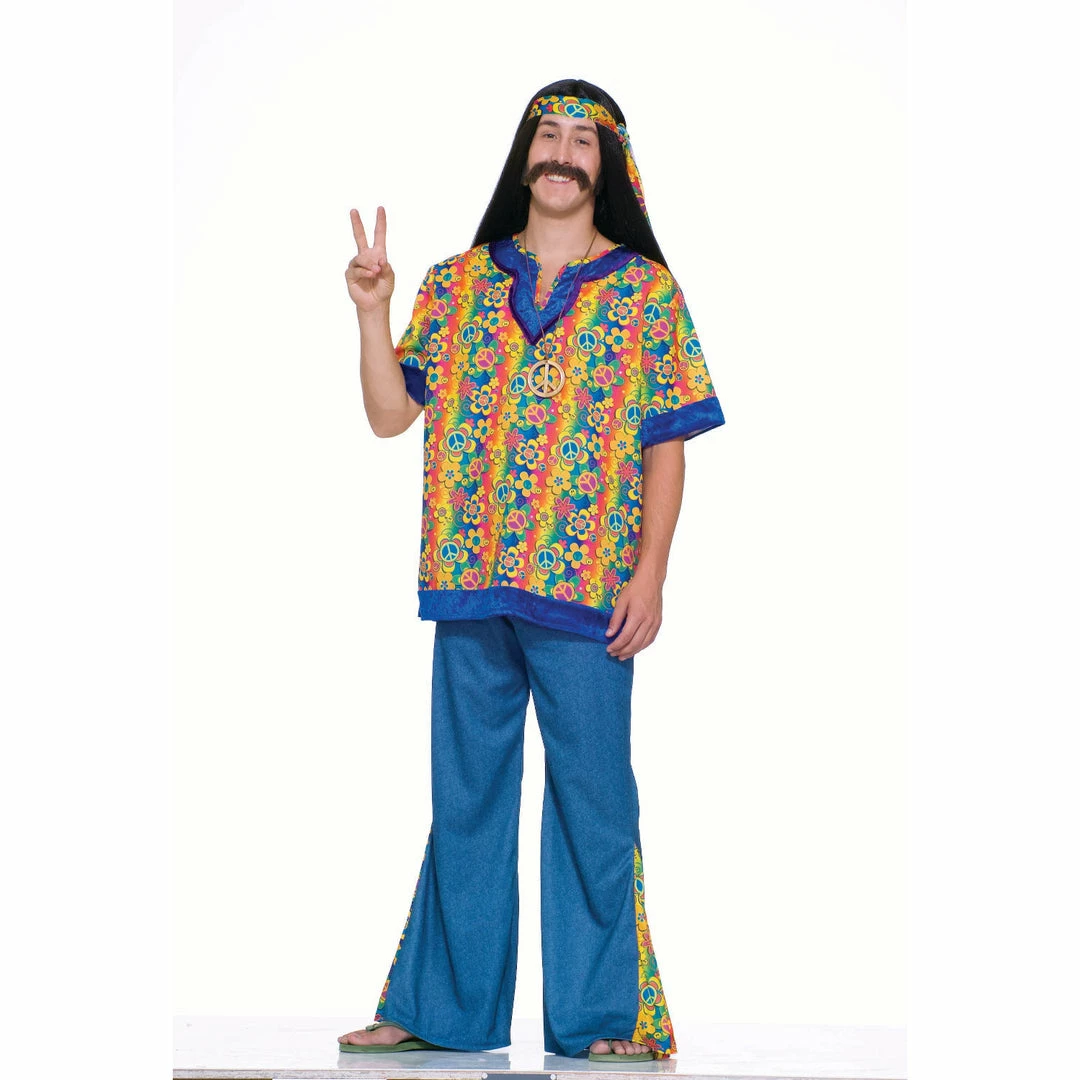This Far Out Hippie Men’s costume with flower power printed shirt, blue flares with matching colorful insert and headband.