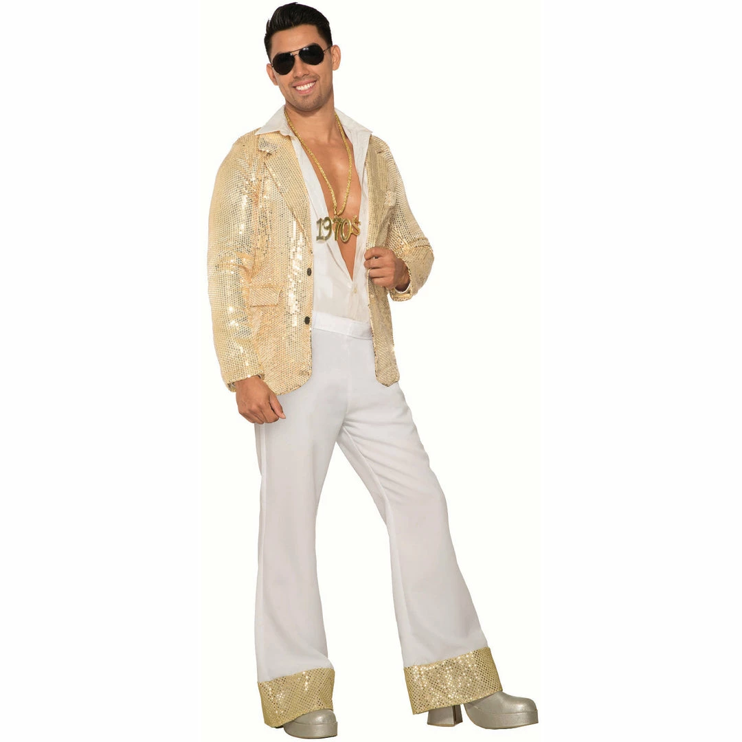Follow the call of the Disco ball and get down to Funky Town. You will be dancing in these white flares with gold sequin trim.