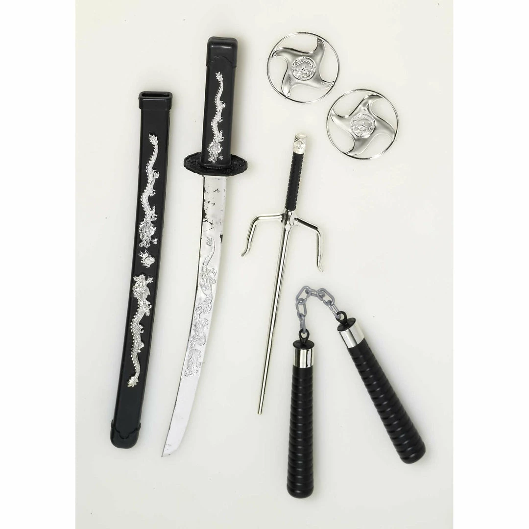 Set includes sword, numchucks, ninja stars, knife.
