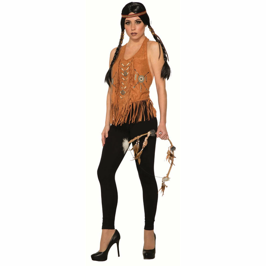 Western Halter Top fringed with printed feather and arrow detail. Fringing down the center front and around the hem of the top plus metal buckle detail.