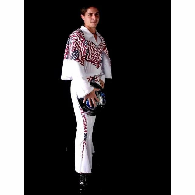 Perform some stunts of your own wearing this cool 70’s patriotic jumpsuit with attached cape. (a helmet is included but it is not exactly the same)