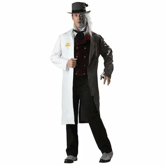 Laboratory coat/tails, shirt with attached vest, dickie with attached tie and top hat with hair attached to half of the hat.