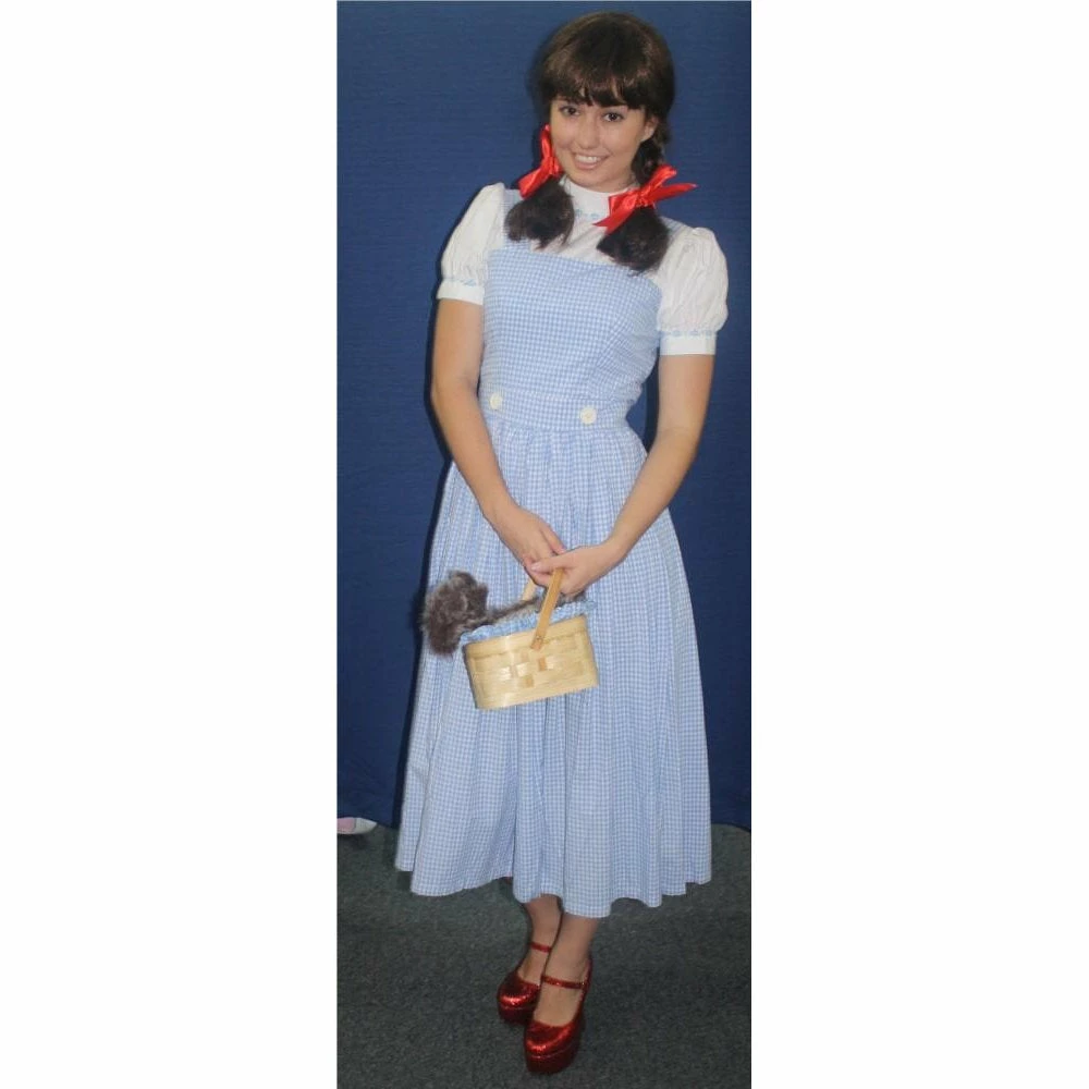 Old fashion Kansas girl with blue and white check dress with white puffy sleeves.