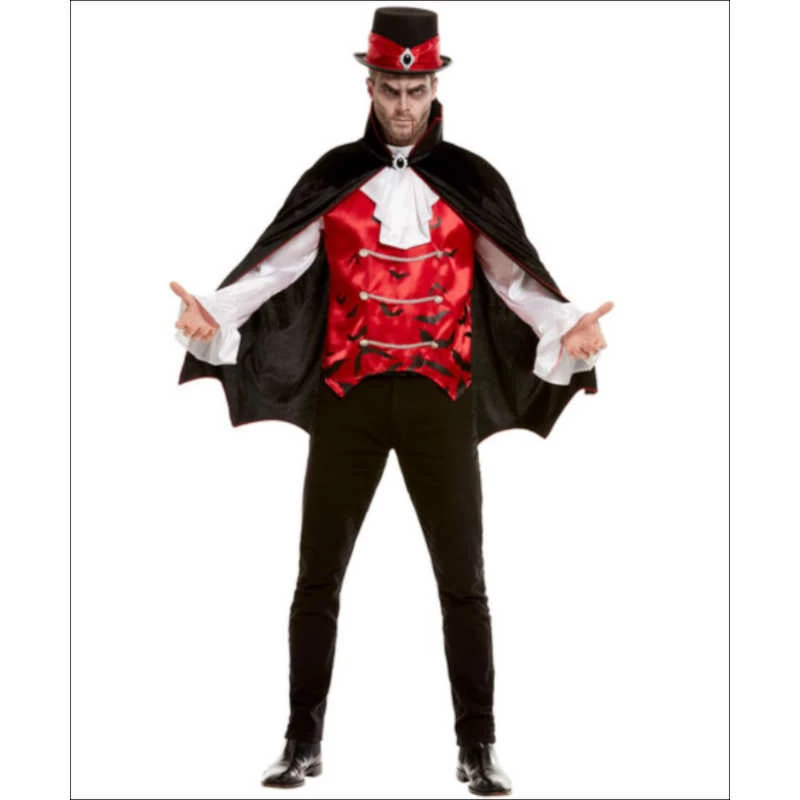Classic style Men’s Vampire costume features vest with bat print vest, double breasted with braid trim with frilly cravat attached to shirt, high vampire collar on cape with jewelled broach. Complete this Vampire costume with teeth, hat and make up.