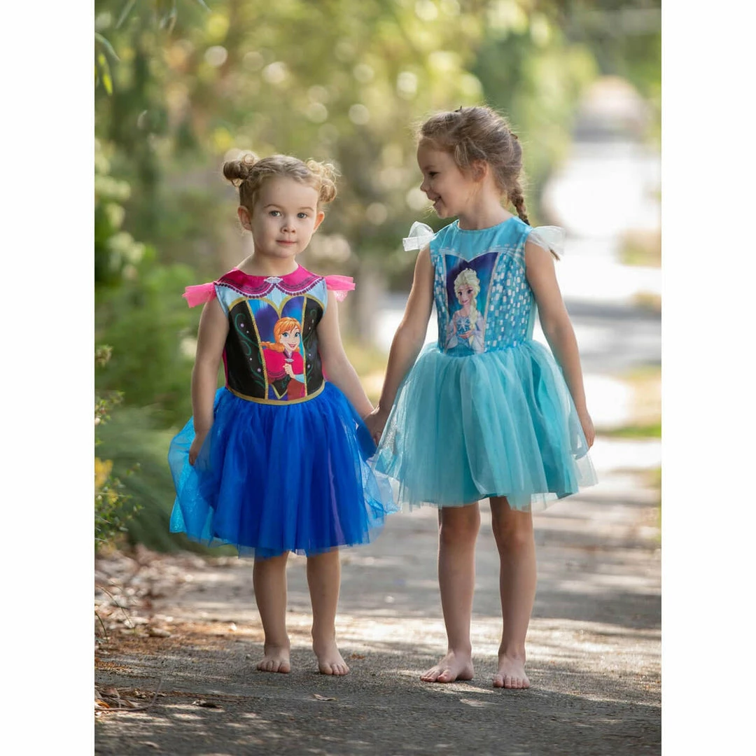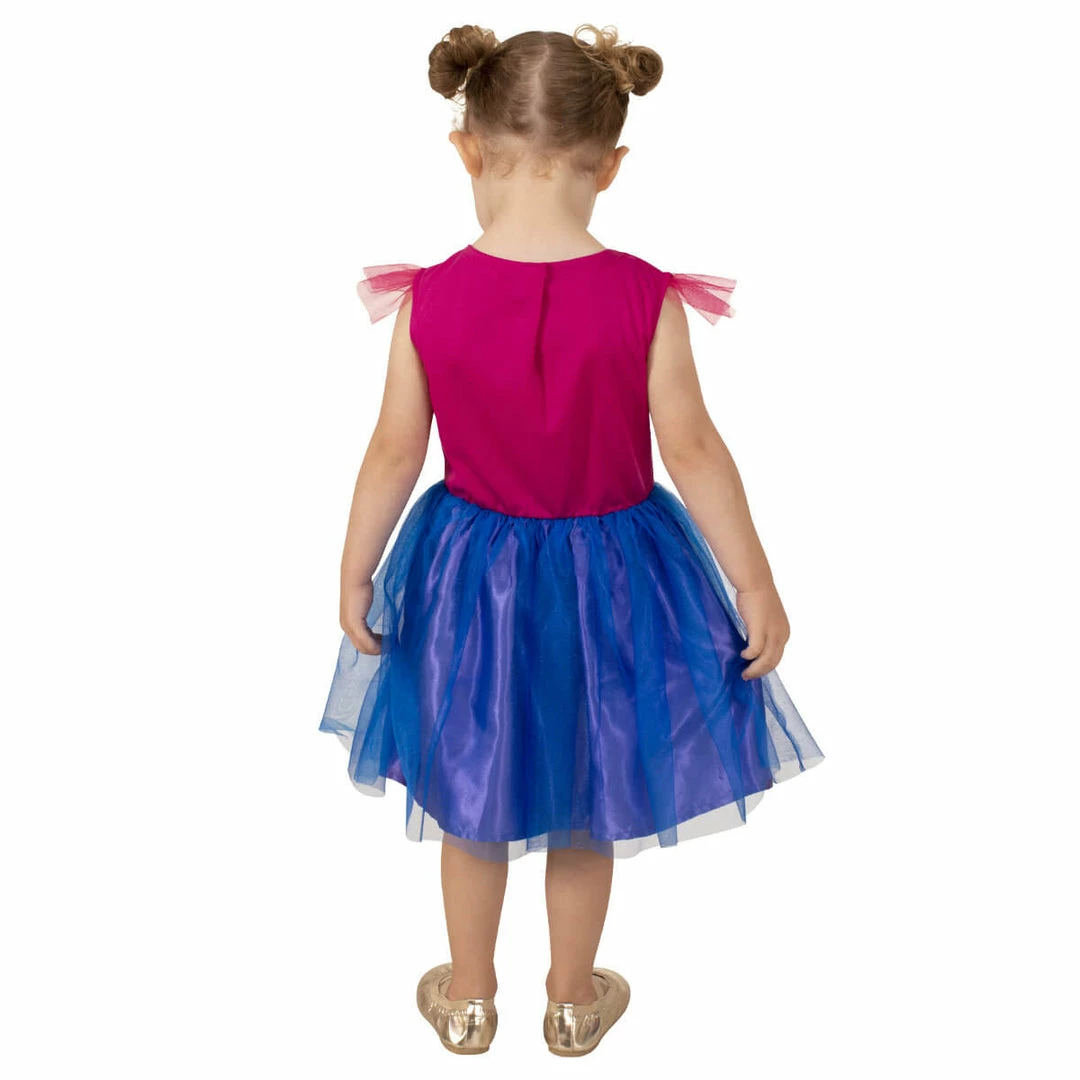This adorable costume features a dress with satin skirt and tulle glittery overlay, bodice is satin with digitally printed character motif and velcro tabs at rear, sleeves are embellished with tulle ruffles. This Costume is perfect to wear when you become Anna!!