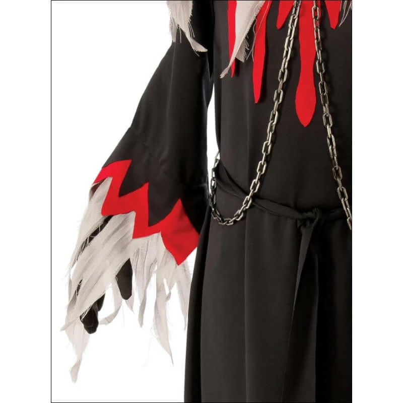 - Ankle length robe with zigzag hem, dripping blood shaped fabric at neck and polyester overlay with raw edge plus chains and clip at neck