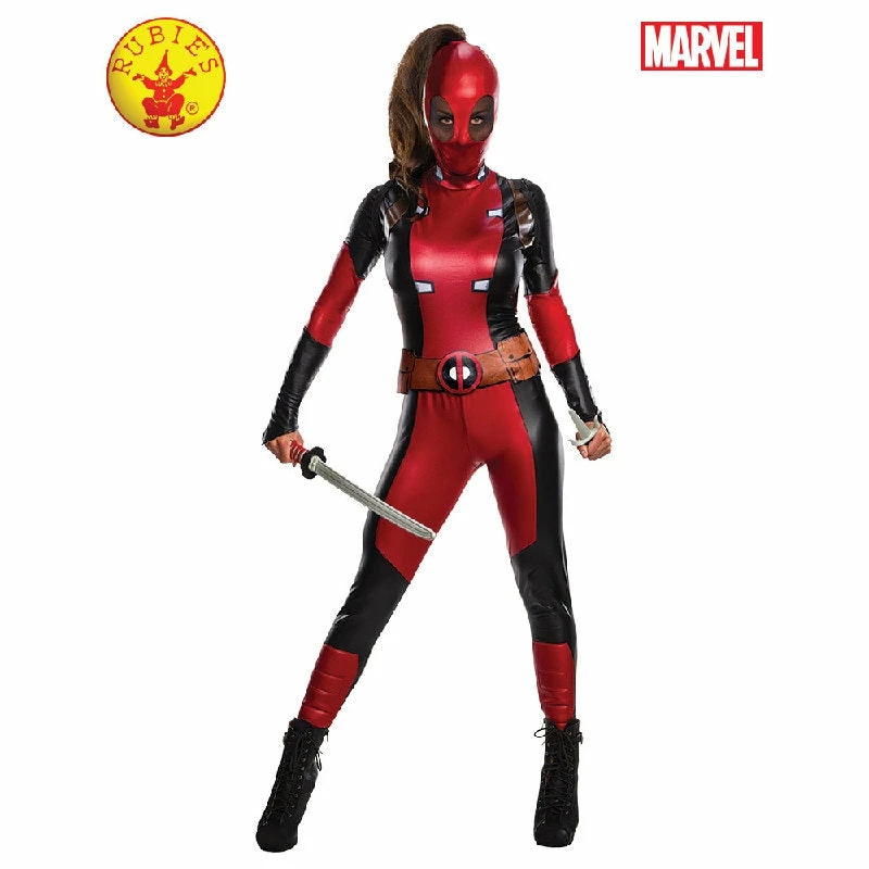 Ladies Deadpool Costume by Secret Wishes. Become the hilarious, naughty and very cheeky Wade Wilson, played by actor Ryan Reynolds. Deadpool is Marvel’s comedic anti-hero of sorts, who has a twisted sense of humour with accelerated healing powers. Disfigured, with mutant abilities, Deadpool is a discharged special forces agent working as a mercenary! Starring in X-Men movies and the self-titled movie in 2018, this is not one for the faint-hearted!
