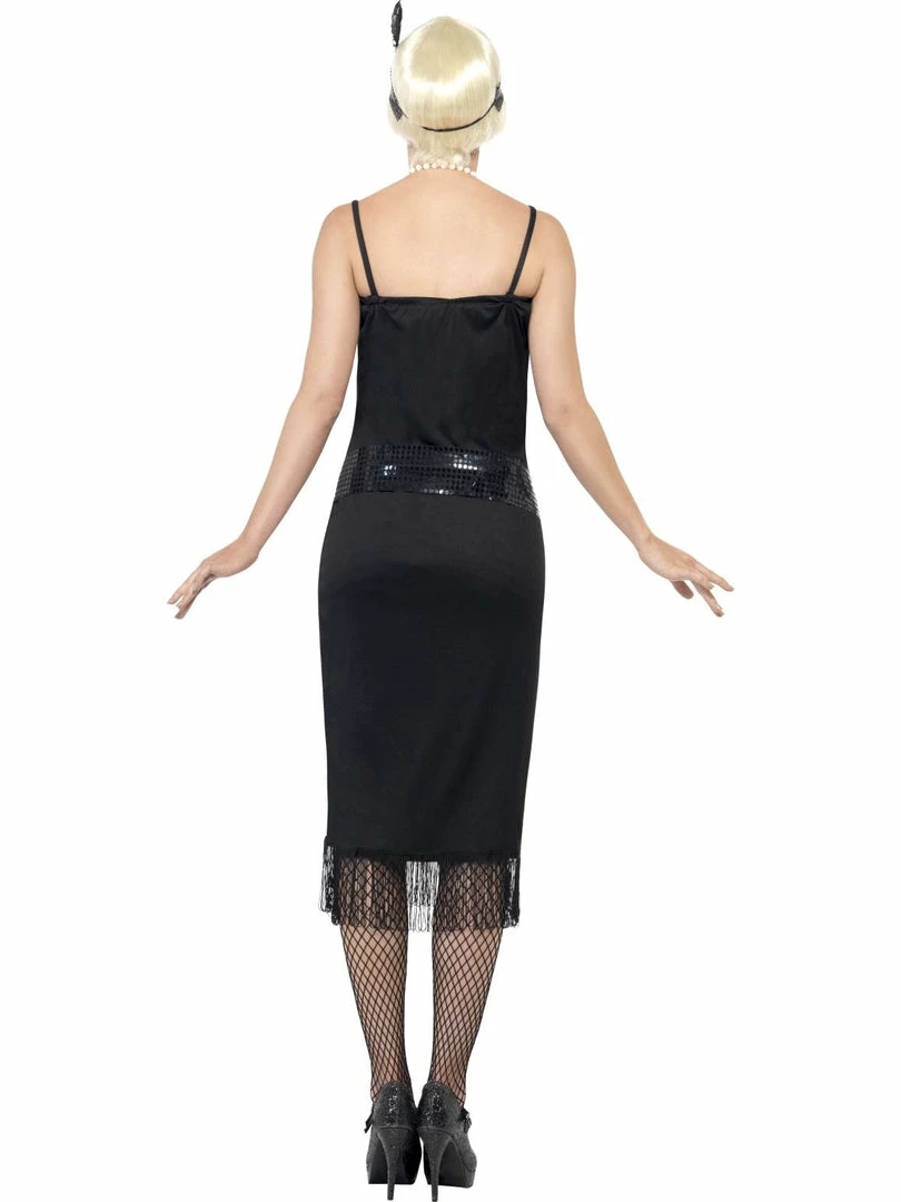 Our 1920’s Simple Black Slip Flapper Costume comes with black fringing around the hemline. Also included with this costume is a black sequin self-tie sash and a matching sequin headpiece with a feather.