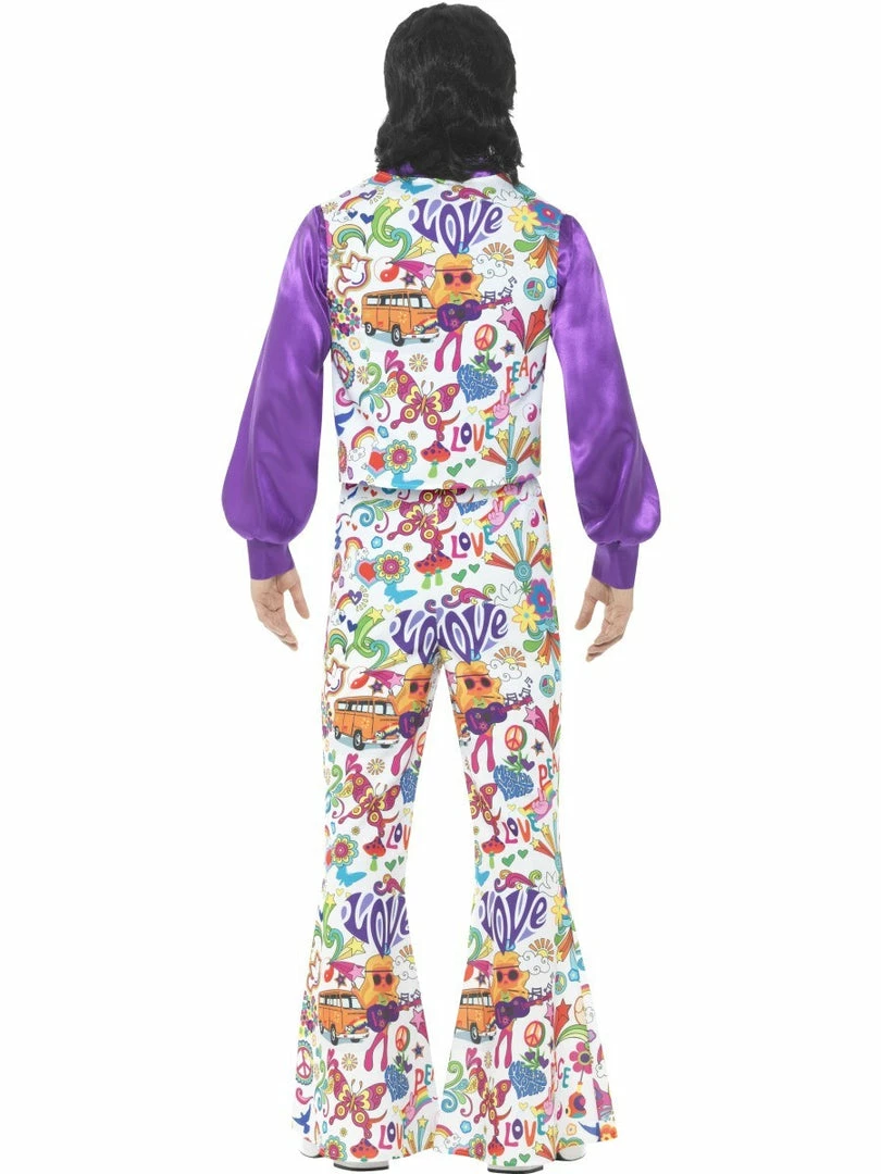 60’s Groovy Hippie costume which includes flares, vest and satin shirt. This is a fun print with combie vans, peace and love symbols. Complete the Groovy Baby look with a longer style wig and moustache.