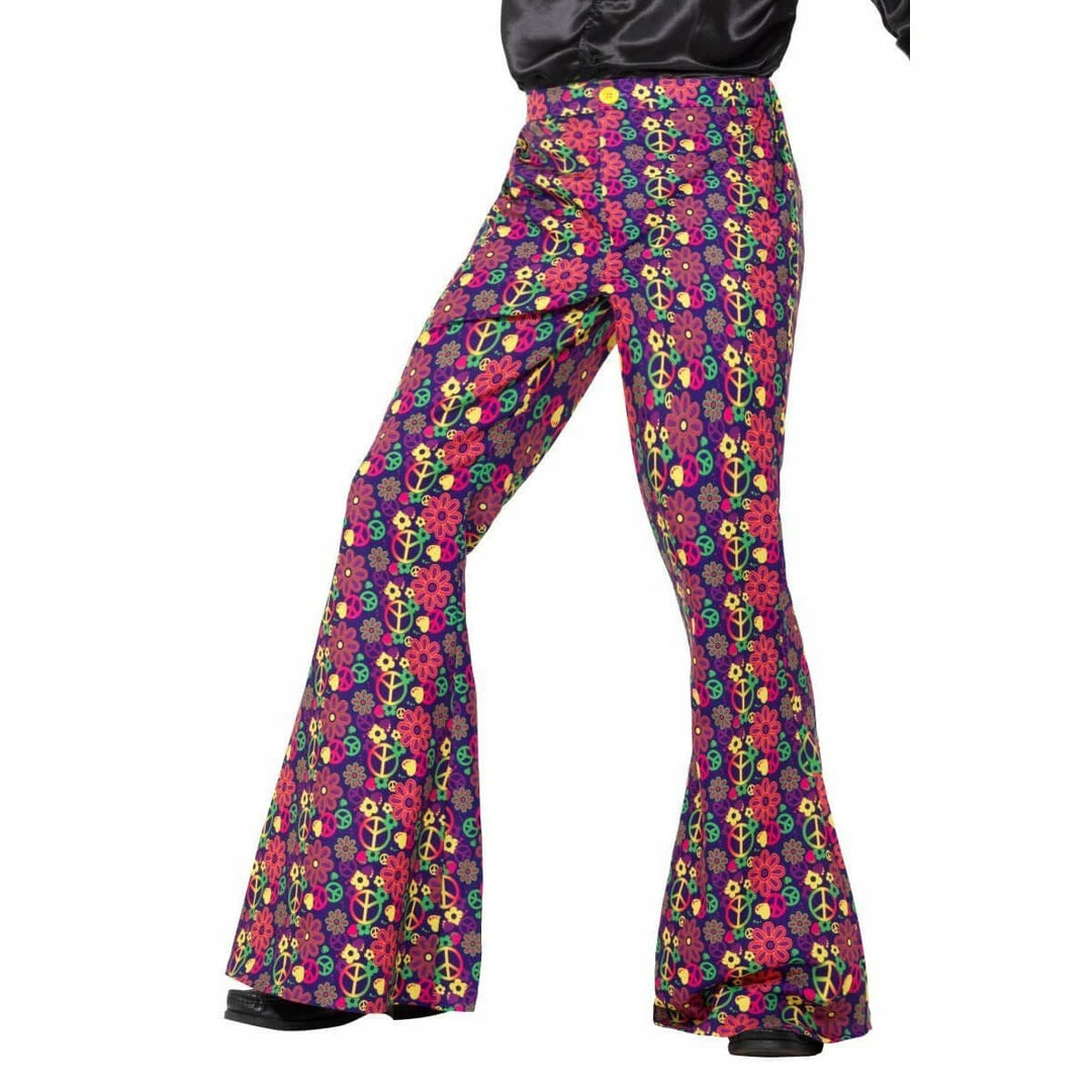 Peace and Love!! Feel like an hippy in the 60s with these Mens 60s Psychedelic CND Flarred Trousers!! These flared pants feature a multi colour peace sign and flower patterned pants on a dark purple material, these are the perfect thing for completing that your retro hippy or disco look at your next themed party!!