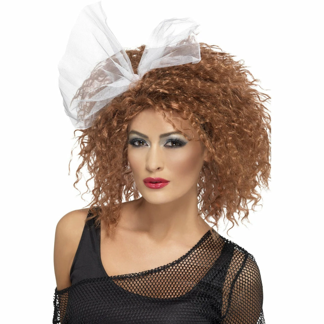 1980’s Wild Child auburn crimped wig with a white tulle bow. Team with a Prom dress, Fluro Tutu or Exercise gear to get the 1980’s look.