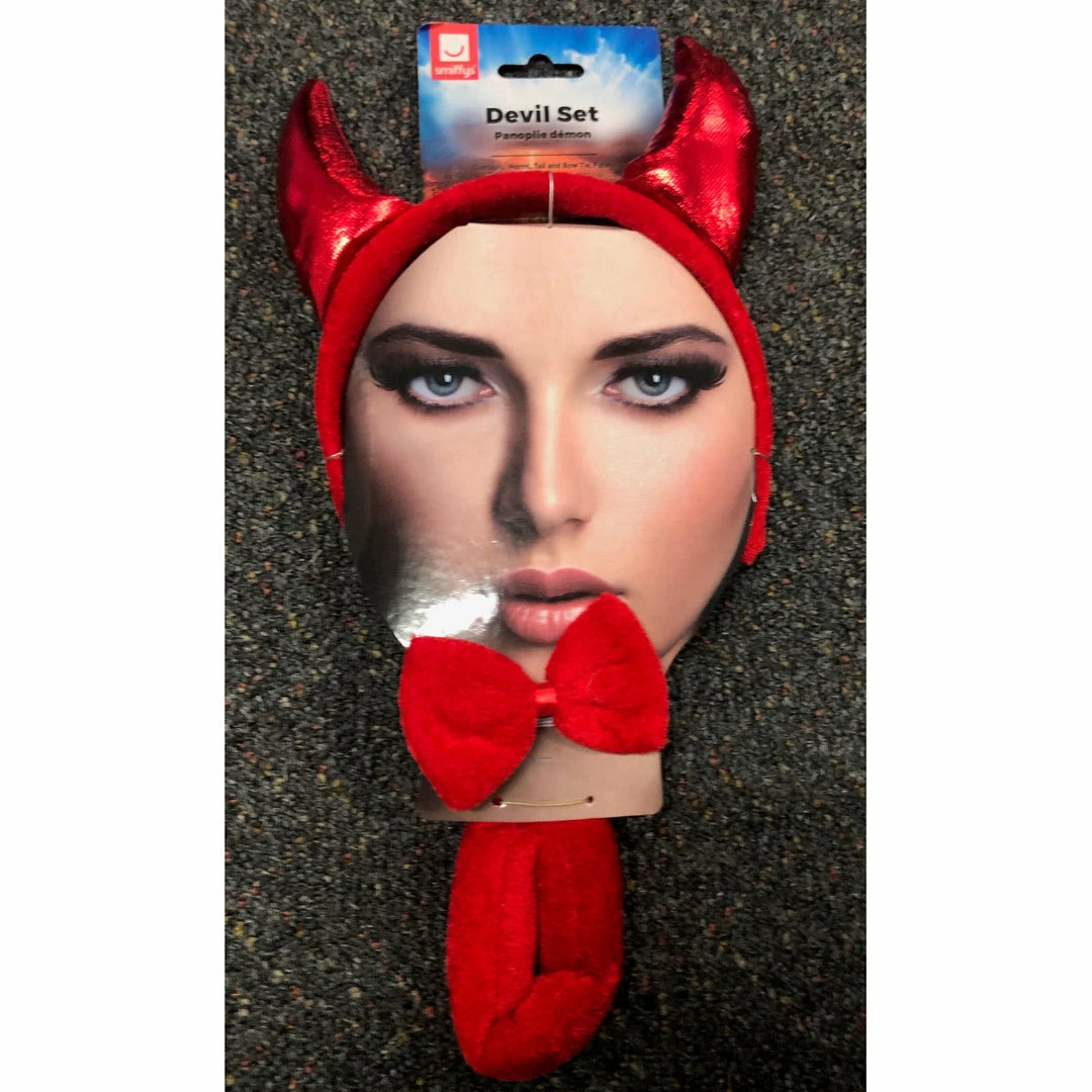 Looking for a quick solution for a Halloween fancy dress costume? look no further than this instant devil set which includes matching devil horns, bow tie and horns. They all come in a plush material with shiny horns and tail end.