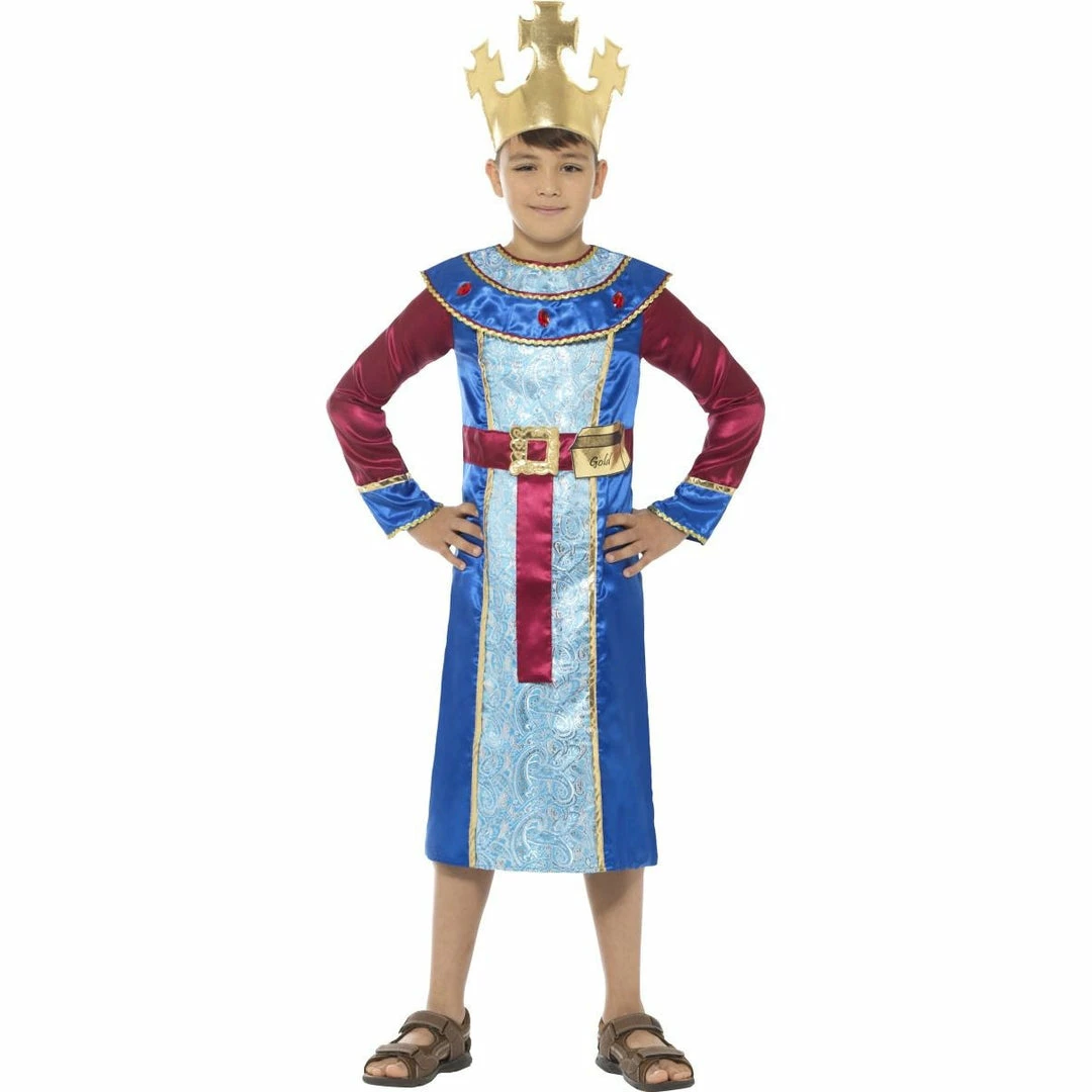 King Melchior Costume features a Red, Blue and Gold detail Robe with attached Gold Bar and Gold Crown.Â