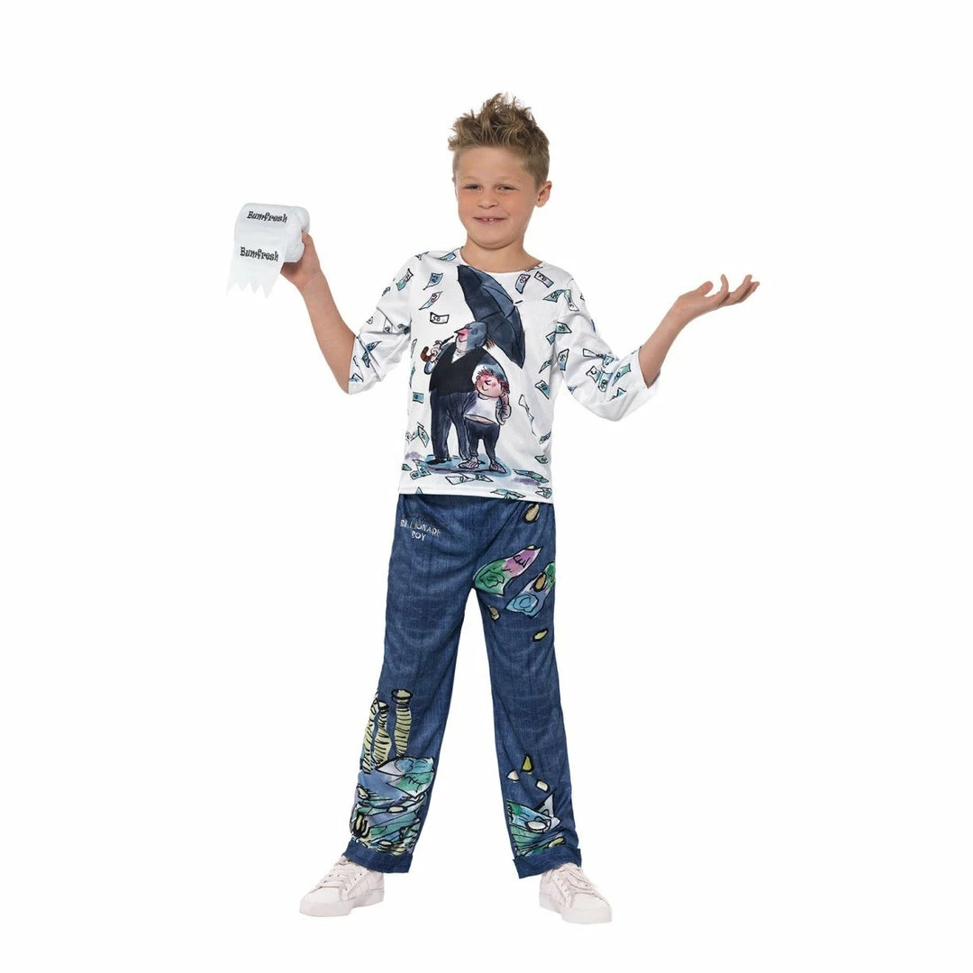 Billionaire boy Joe Spud costume from the book of the same name by popular author David Walliams. Costume includes long sleeve shirt with father Len and his son Joe printed on the front and surrounded with $50 notes. Stacks of money are printed of the pants complete with “The world of David Walliams Billionaire Boy’ logo. Comes complete with Bumfresh toilet roll accessory with sound chip.