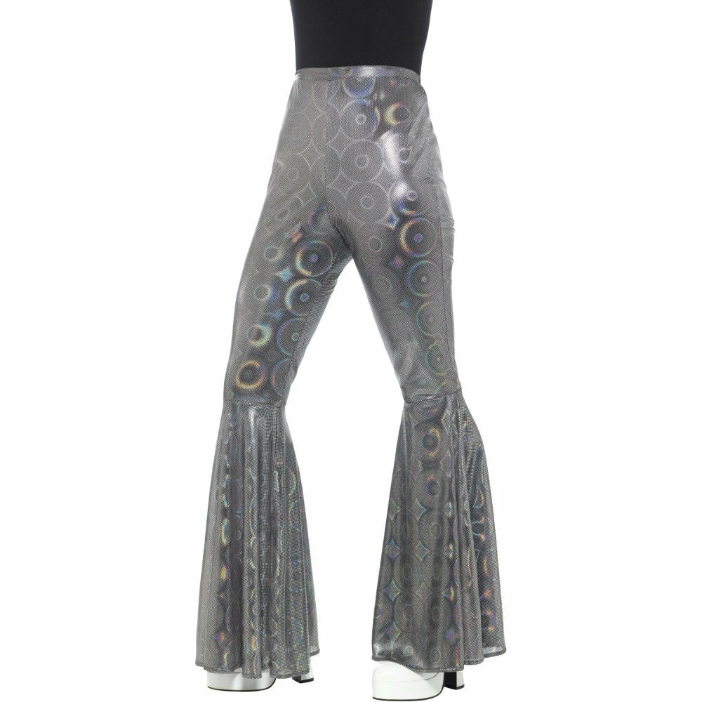 Ladies silver flared trousers also known as bell bottoms were very popular in the 1970s, made popular by Sonny and Cher.