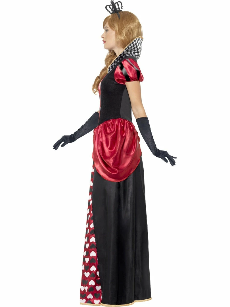- Long Royal Red Queen costume with hearts down the front and red trim.