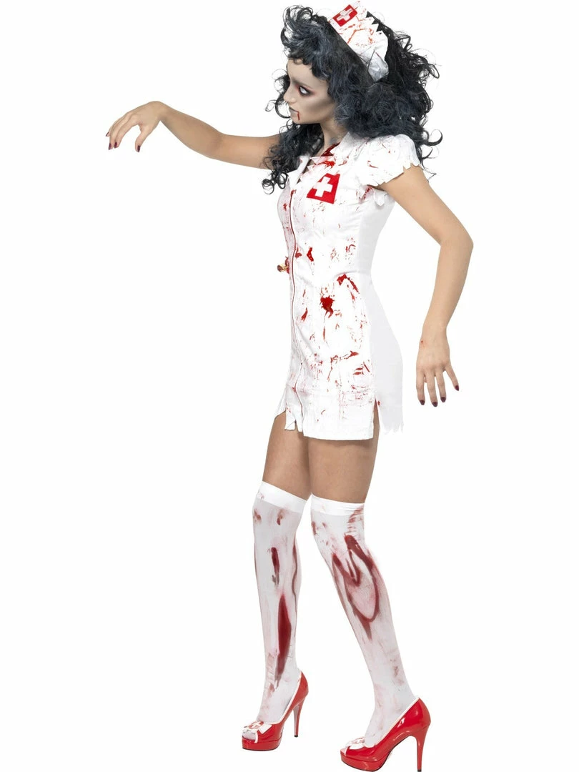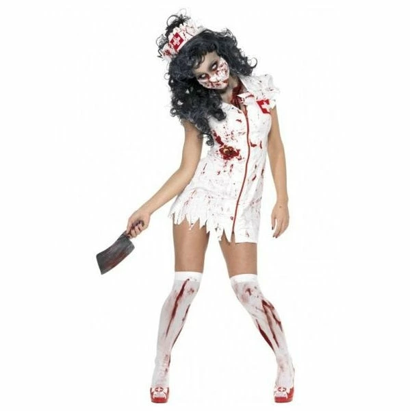 Join the undead with the Zombie Nurse Costume. This gruesome ladies Halloween fancy dress costume is one of our most popular. To complete the look add our Blood Splattered Thigh High Stockings and extra blood to finish off. You won’t cure any ailment wearing this costume! Happy Halloween and Zombie Walk.