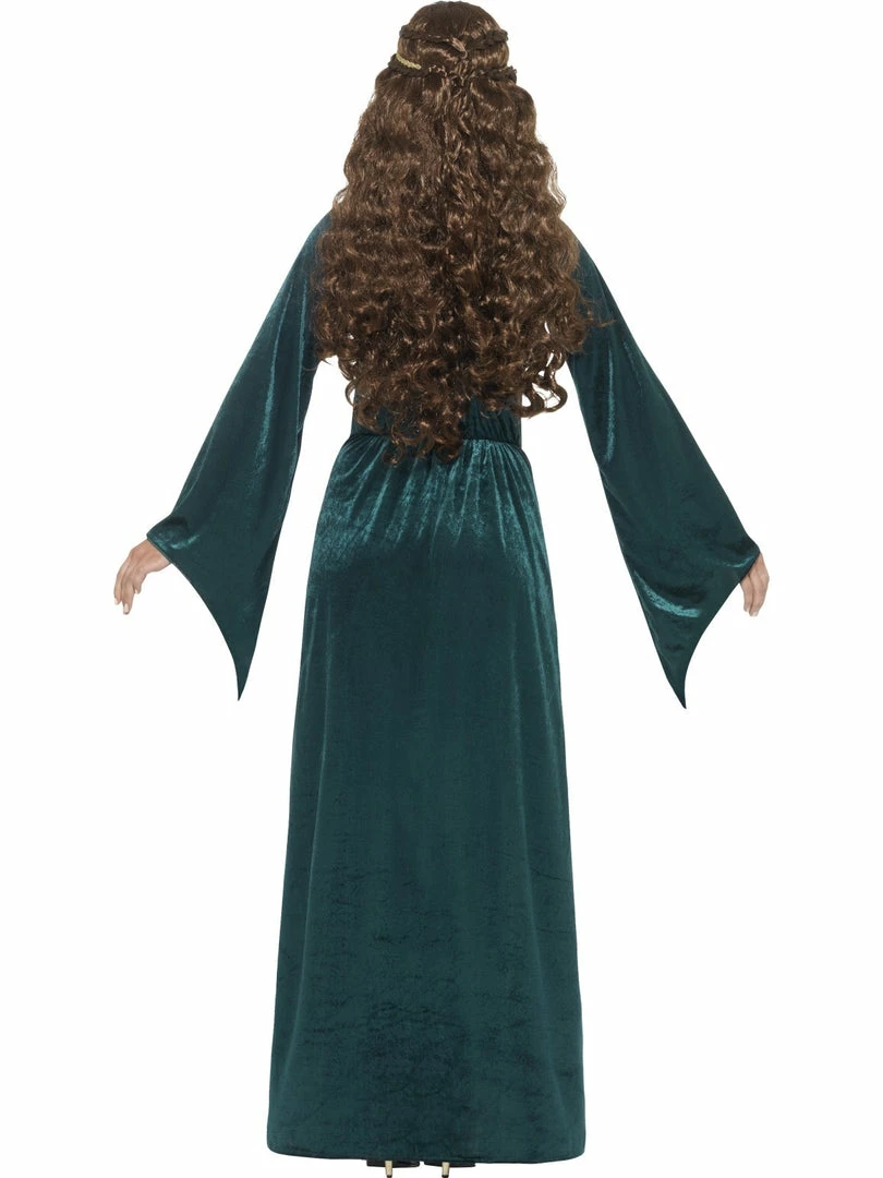 Beautiful Green Medieval Maid Costume, loose fitting gown with bell sleeve and feature braid belt.