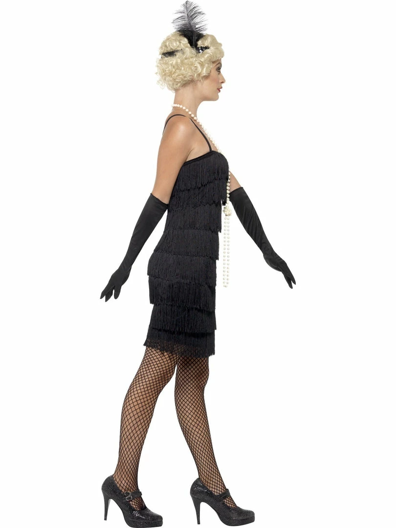 Short black Flapper costume with fringing on the front and back, includes headband and gloves. Complete the look with a wig, beads and fishnet stockings.