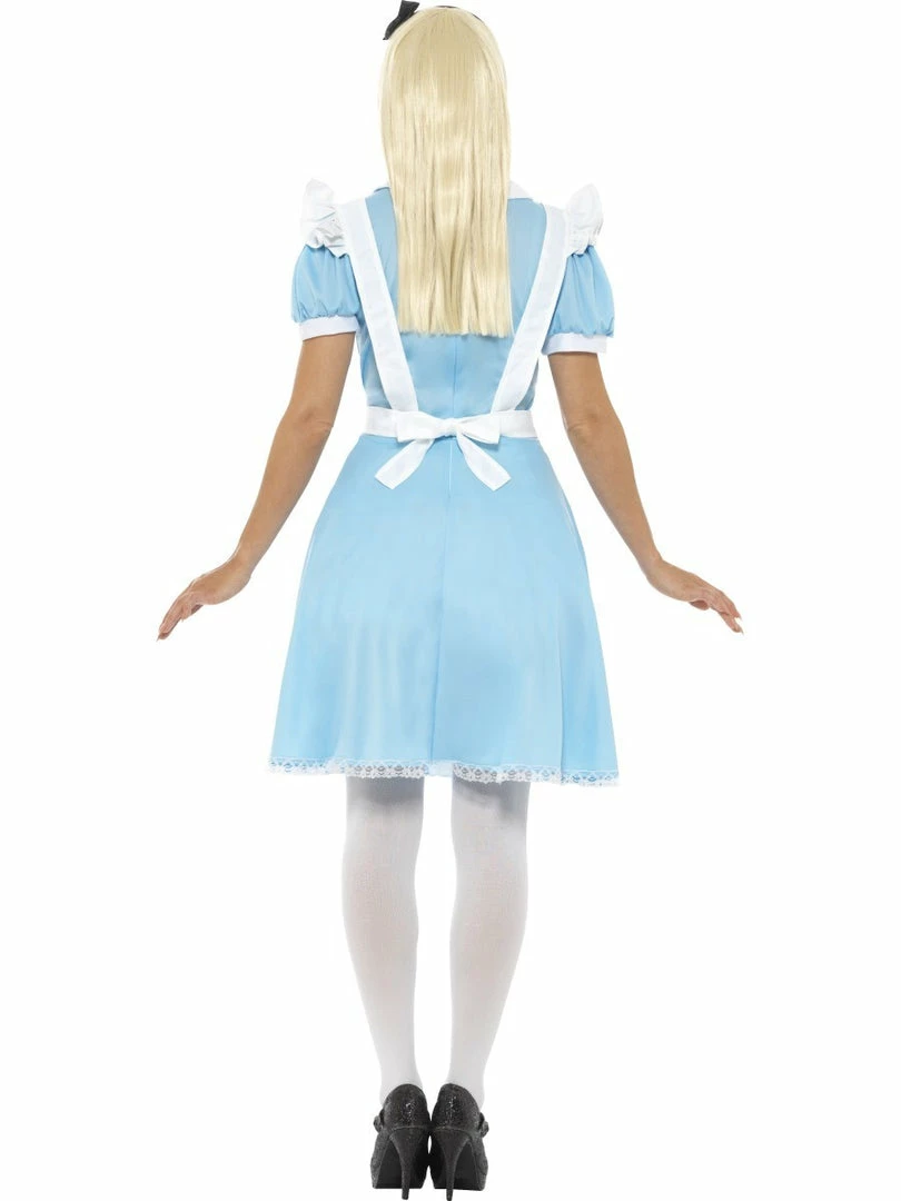- Knee length blue dress with contrasting peter pan collar and puffy sleeves and ribbon trim.