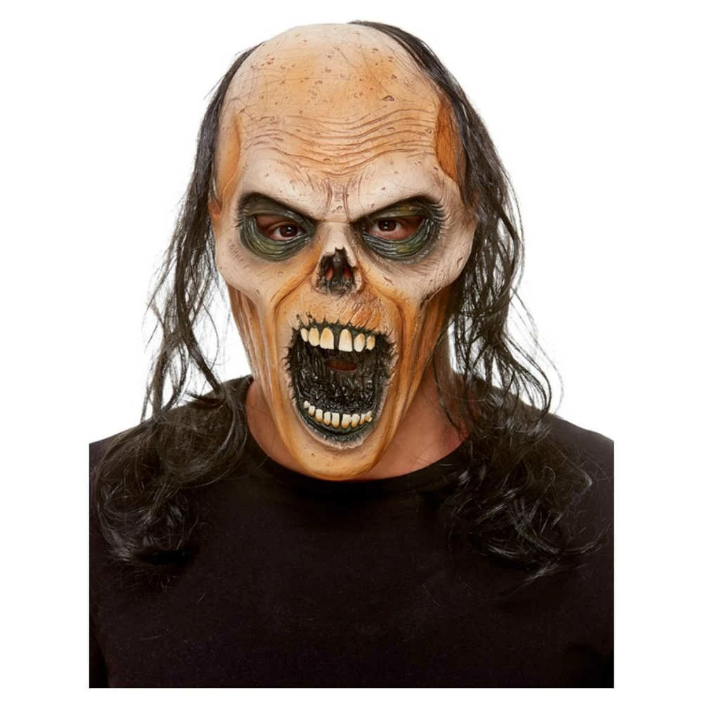 Brown latex Zombie mask will freak your friends out this Halloween. This scary mask comes with angry expression, balding forehead and strands of long wispy hair. This is a fabulous mask for Halloween and Zombie Walk.
