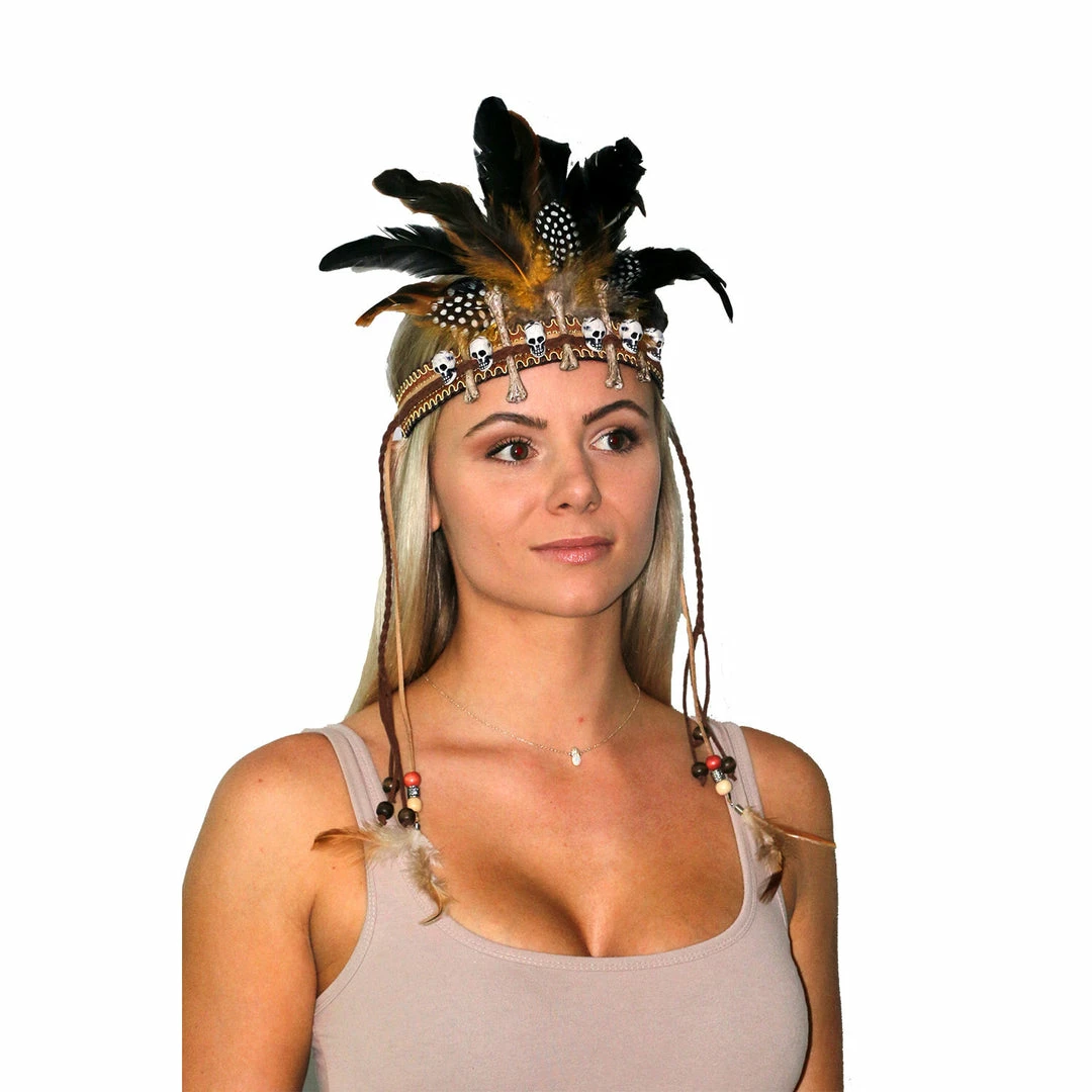 This is a fun festival headpiece with skulls, bones trimmed with leather, beads and feathers.