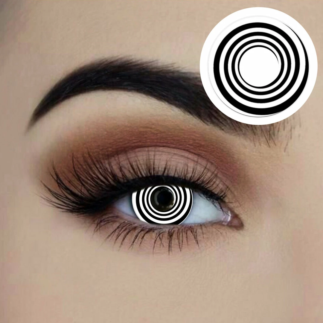 Work your mesmerizing gaze with these hypnotic black and white spiral contact lenses!! These are perfect as a finishing touch to your creepy clown, hypnotist or horror costume!! The lenses feature a black and white spiral and are comfortable and fun to wear. Each set of these lenses can be used for 12 months (1 Year) once you open them if cared for correctly!!Â