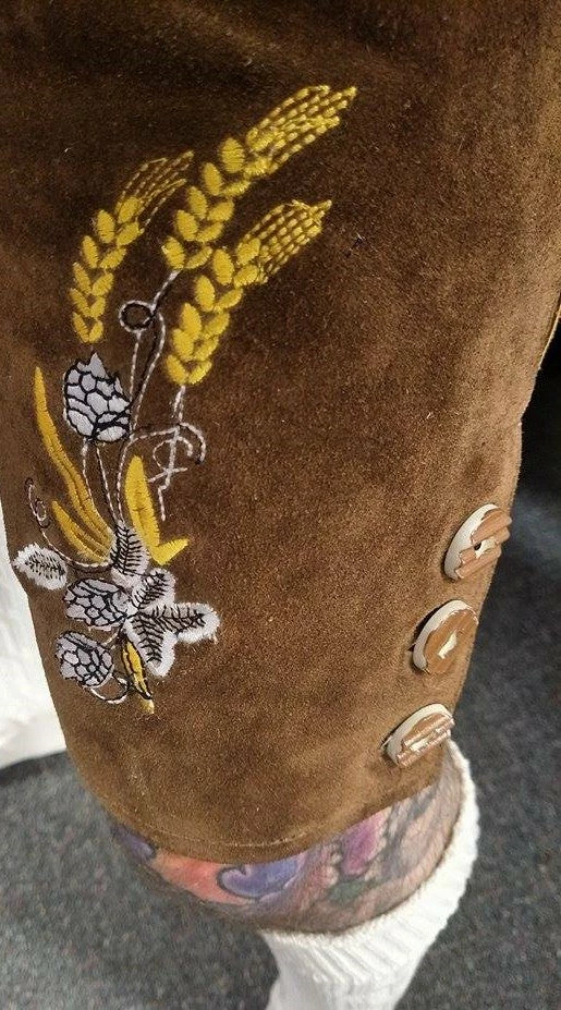 Shorts and braces are made from real leather with detailed embroidered designs.