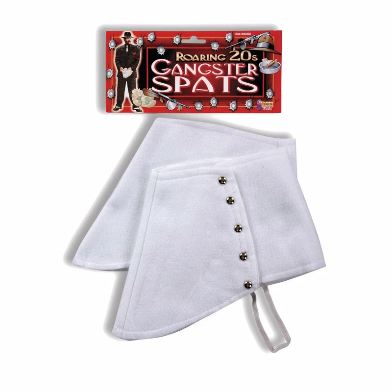 Rule the city in the 1920’s with these Gangsters white felt shoe spats. Spats are made of a white felt with elastic attached to the bottom to fit under the sole of your shoe, keeping the spats in place. The spats have a side opening which fastens with velcro and round silver studs to decorate.