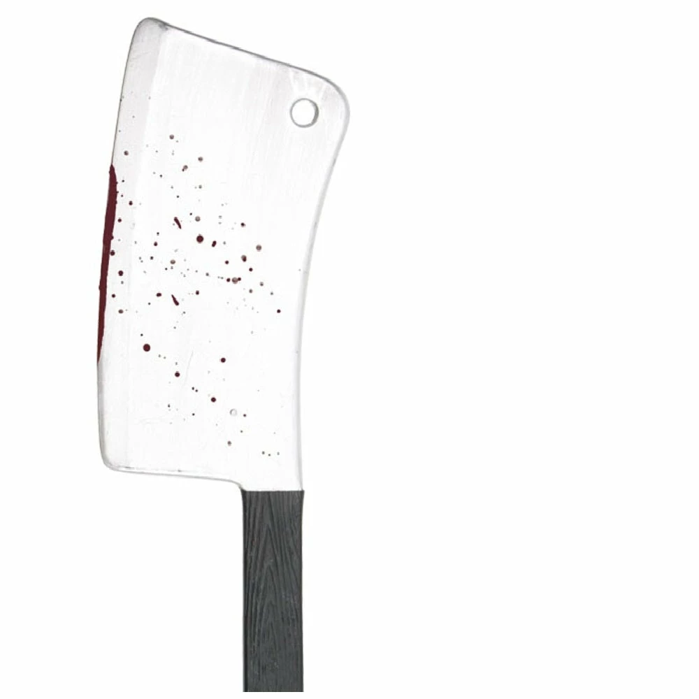 Halloween Butcher Cleaver with black handle and blood splattered silver blade, measures 43 cm.