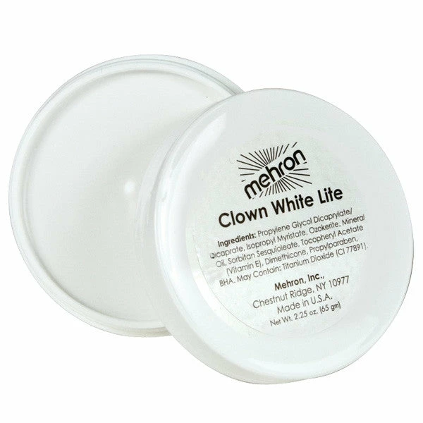 This lanolin-based, highly pigmented Clown White Lite provides maximum whiteness, but can be used sparingly and still maintain full coverage and easy application. When it comes to white face makeup for clowns, there is nothing that compares to Mehron Clown White except Clown White Lite, with all the same whiteness as the original. There is no substitute for white clown face makeup made by Mehron, Leaders in Theatrical Makeup since 1927. Clown White Light is perfect for mimes!