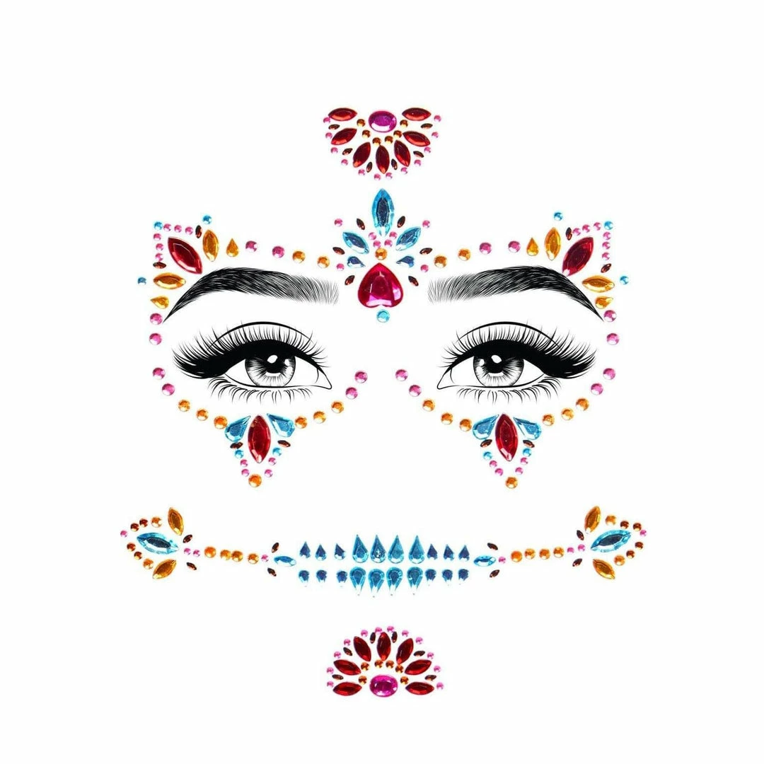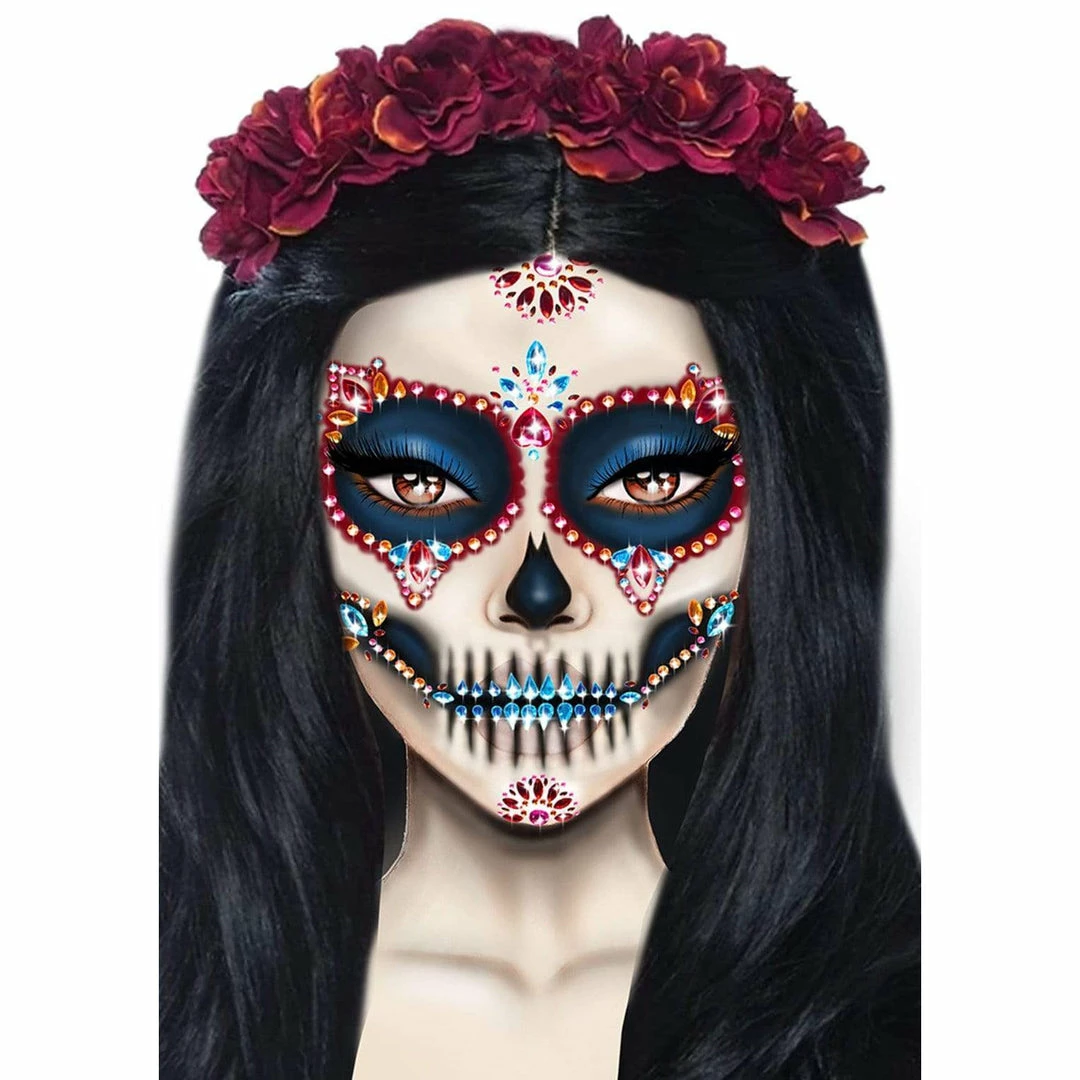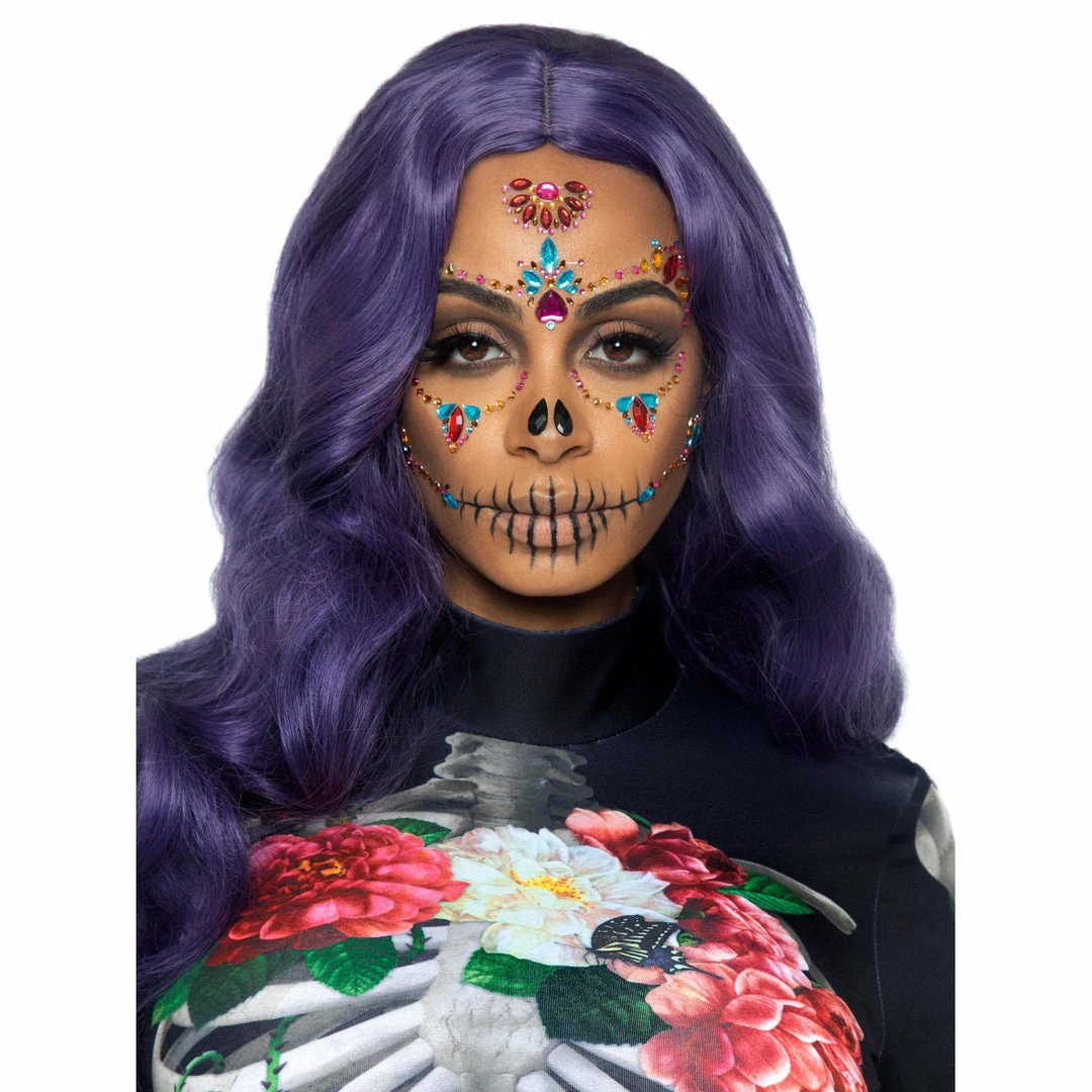 Day of the Dead Skeleton Face Jewels is the perfect way to take add glam to your Day of the Dead costume! Stick on adhesive face jewelry and body jewelry feature gorgeous high quality rhinestone for all day sparkle and shine. Perfect for Halloween, Day of the Dead themes parties, or any dress-up or costume event. Skin-friendly and easy to use.