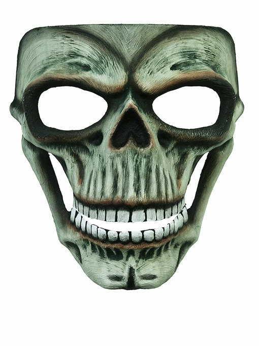Green unearthed evil skeleton unearthed face mask is the perfect accessory paired with a black cloak for a scary Halloween outfit.