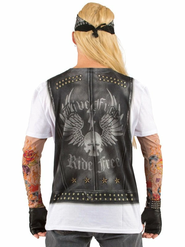All the style of a leather vest with tattoo sleeves wrapped up in a comfortable t-shirt. This super realistic t-shirt with a biker vest and tattoo arm sleeves is sure to get a lot of second looks! Works great as an every day shirt to stand out from the crowd, or as a simple and easy costume. Live Free, Ride Free!