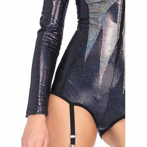 Ladies Shimmer Iridescent Skull Garter Bodysuit by Leg Avenue. This outfit is only the body suit, a complementary purchase would be thigh high stockings – particularly fishnet thigh highs.