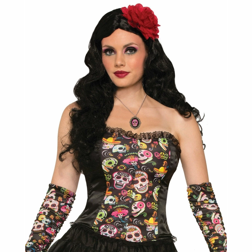Day of the Dead print Corset which includes ribbing and black lace trim. Team with gloves, flower headband, wig and jewellery to complete the look.