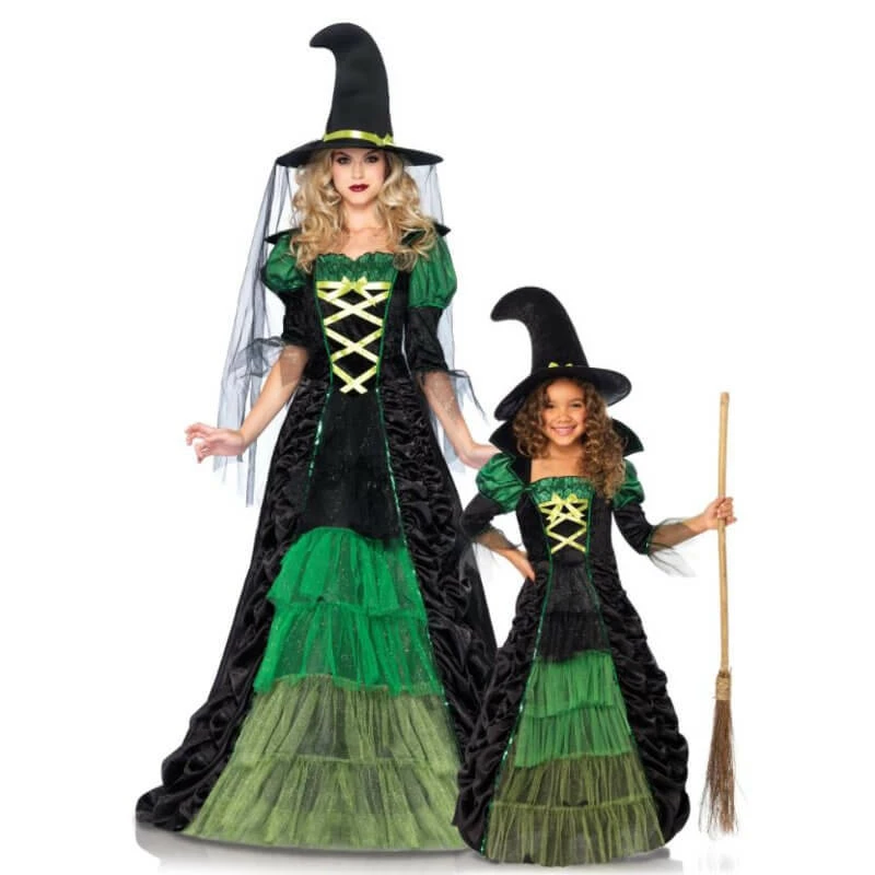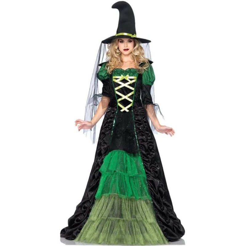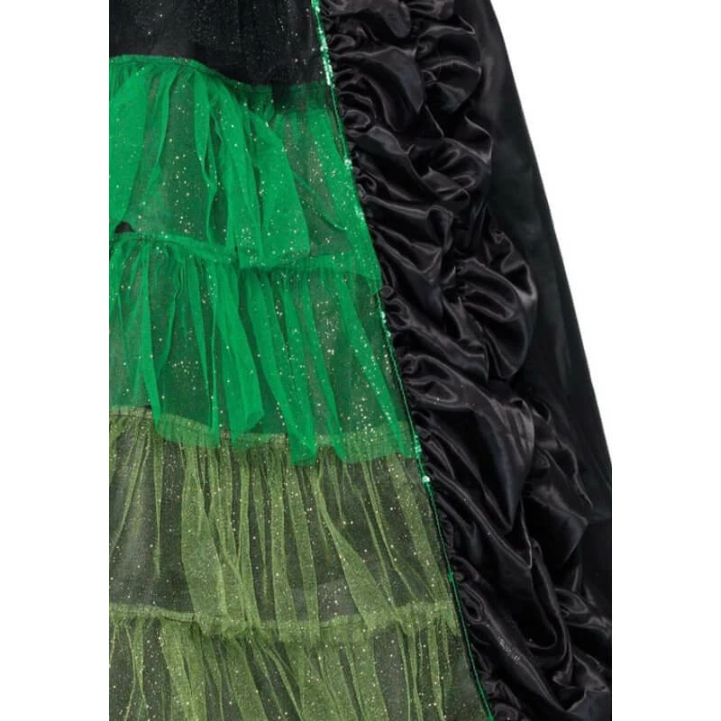 - This classic women’s costume features a stunning long satin witch dress with ruched skirt and tiered glitter tulle centre panel, sequin trimmed stay up collar.