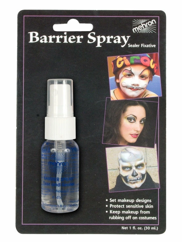 Mehron’s Barrier Spray™ is a clear liquid spray that sets makeup designs and helps protect sensitive skin from makeup, latex and other adhesives. Great for extending the wear of makeup applications for Modeling, TV, Stage, Clowning, Face Painting, Halloween, Special Effects and Photography!