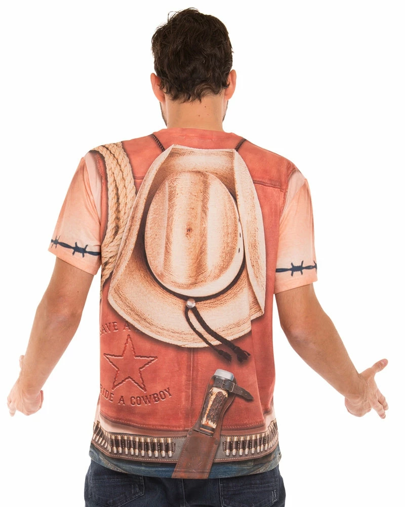 This super realistic t-shirt with a Cowboy print is sure to get a lot of second looks! Works great as an every day shirt to stand out from the crowd, or as a simple and easy costume. Live Free, Ride Free!