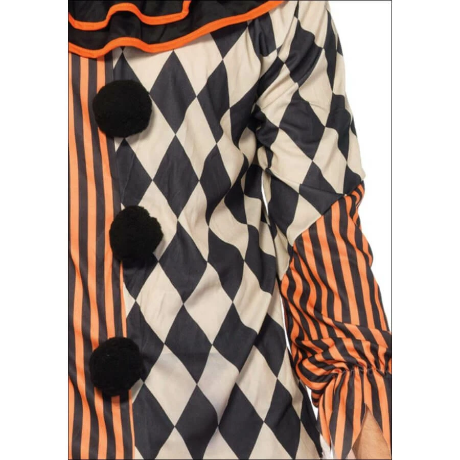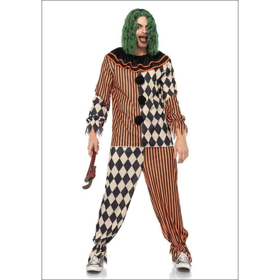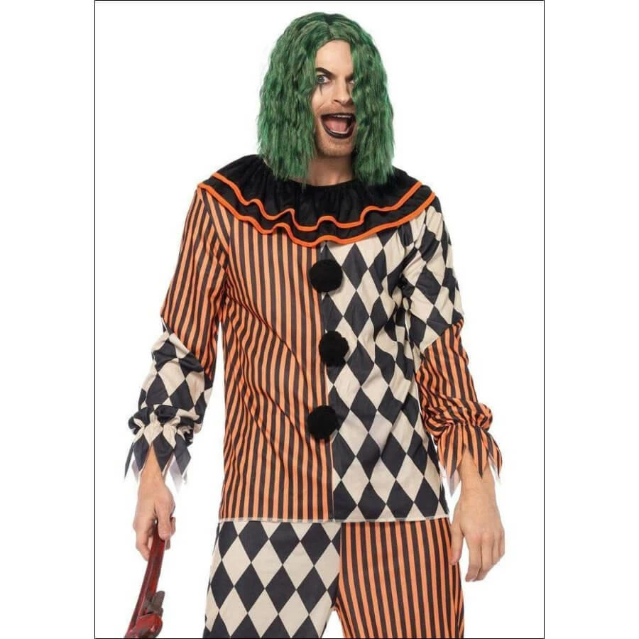 Leg Avenue’s 2 PC Creepy Circus Clown costume for men looks like something out of a child’s nightmare! This seriously scary Halloween costume features harlequin print fabric in traditional Halloween colors, this killer clown shirt and pants set is spine chillingly perfect. This clown is easily customizable, ready for blood splatter and face paint. Check out our range of wigs and make up for the ultimate Halloween clown.