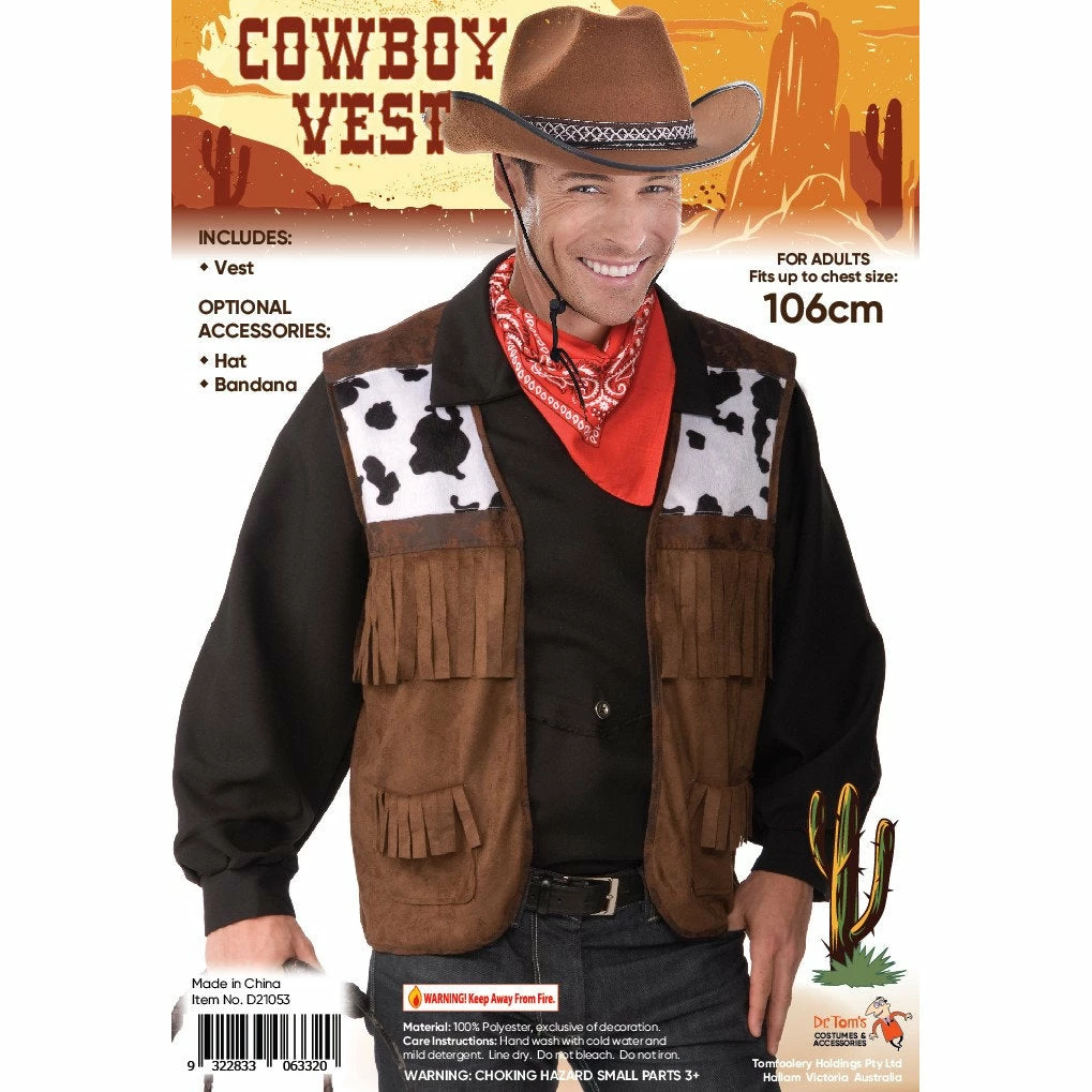 Wild West Fringed Cowboy Vest for men and ladies has cow print insert, fringing and two pockets.