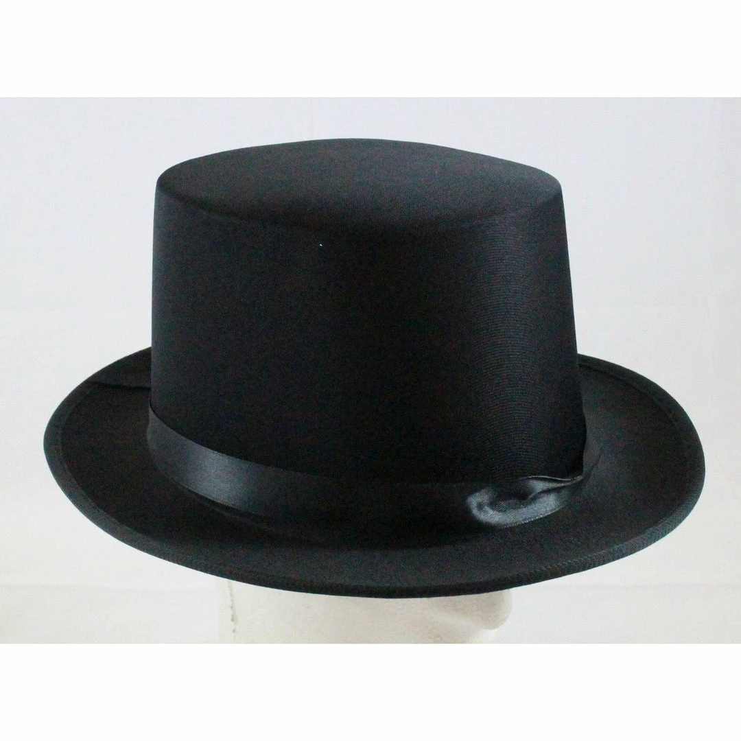 Adult black top hat made from covered foam and is flexible for easy wear.