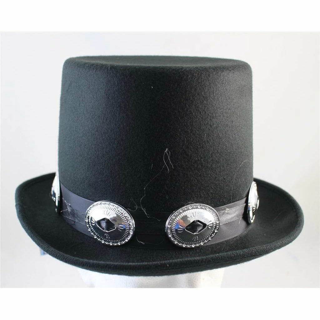 Rock out with this Slash Style Top Hat! Made of black suede, featuring silver plated buckles around the band and elastic on the inside for a good fit. This hat is sure to have you rocking out at your next Rock ‘n’ Roll or 1980s/1990s party!!