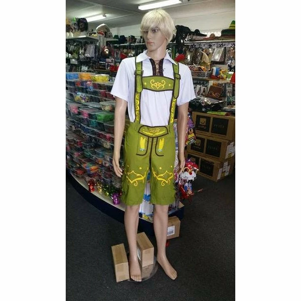 Klaus, green Lederhosen costume with adjustable suspender shorts, gold prints and lace-up collared shirt.